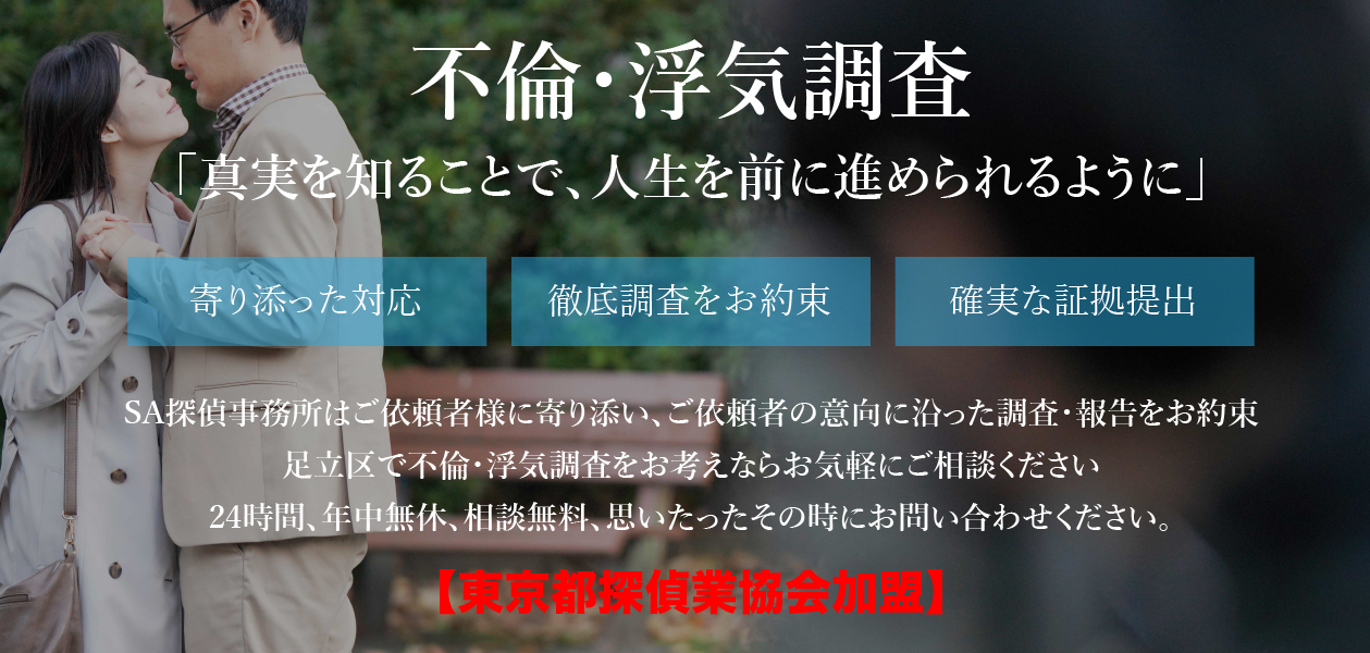 足立区で浮気・不倫の可能性にお悩みなら、SA探偵事務所があなたの味方になります。まずはお気軽にご相談ください。